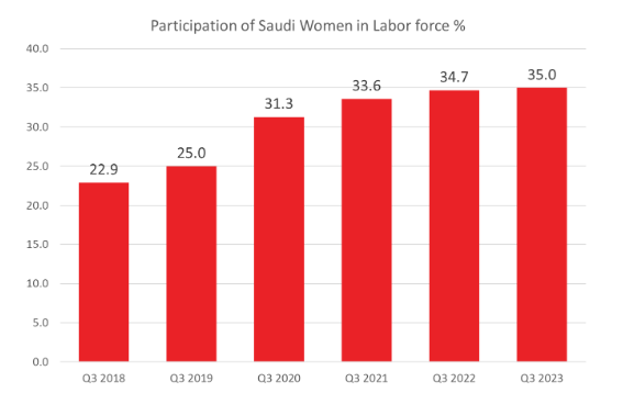 - Saudi women participation in the labor force rose from 17% in 2017 to 35% in quarter 3 of 2023.